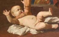 Joseph et Marie sont auréolés, Jésus rayonne d’une lumière en forme de croix. Jésus a déjà un corps proportionné à celui d’un homme. Posé sur un linge blanc le Christ péfigure le sacrifice, la crèche devient autel. La nudité de Jésus, dépouillement total préfigure la Croix. Jésus tend ses mains paumes tournées, vers Marie, ce geste est prémonitoire, c’est celui du ressuscité qui lui montre ses plaies.