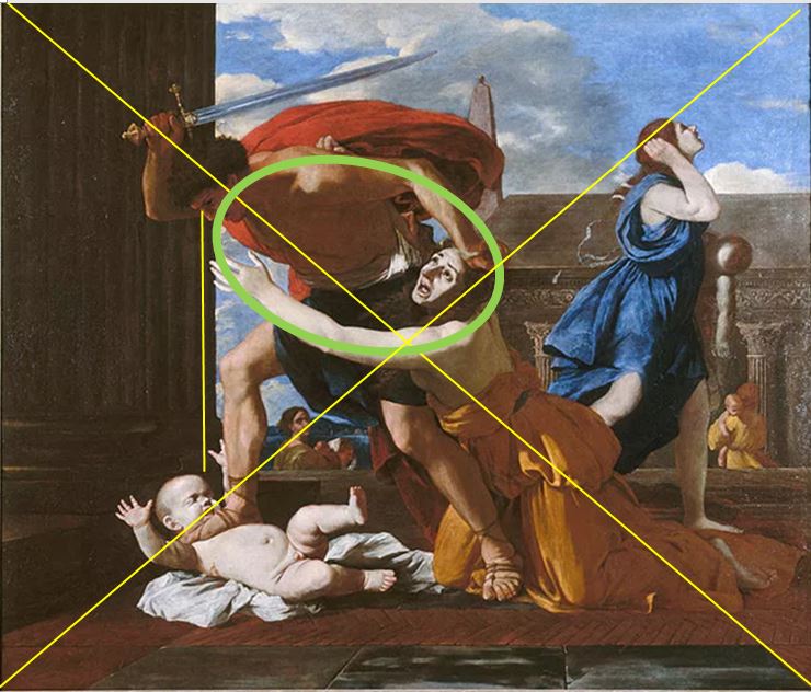 Le pire est en train de s’accomplir, ainsi qu’il pourrait s’agir d’une image extraite d’un film d’horreur antique. Poussin a pris le contrepied de toutes les représentations faites du massacre des innocents. Ici la scénographie fait de cet acte abjecte un spectacle emblématique et intemporel se concentrant sur un innocent.