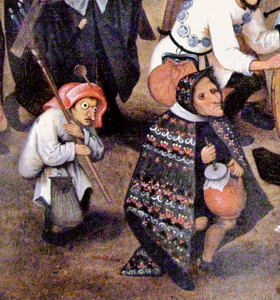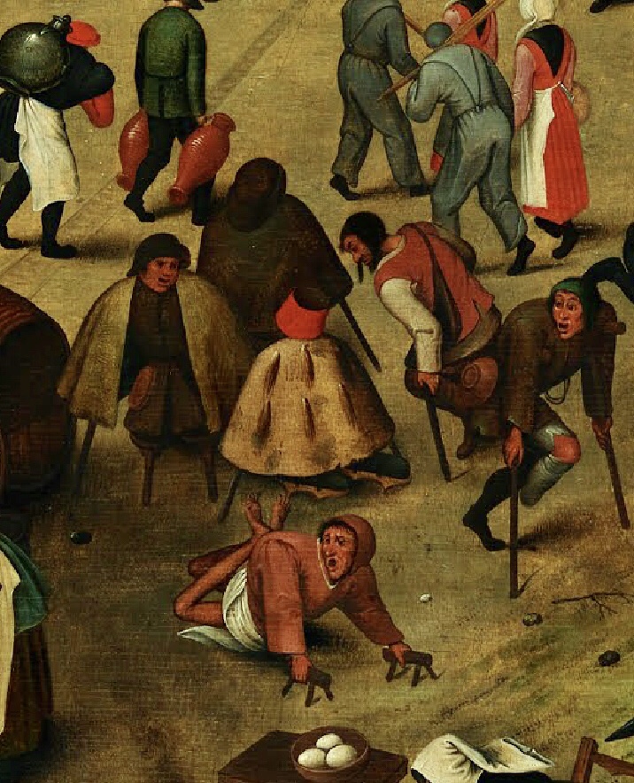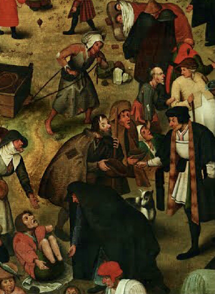 9) Les extrêmes se mêlent pacifiquement : Le noble, les pauvres et les mendiants, cohabitent sur cette places toutes les conditions : les forts et les faibles, les riches et les pauvres, les bien-portantes et les affamés Les mendiants, infirmes, sont dispersés par petits groupes : il est facile de distinguer des aveugles et plusieurs estropiés. Des malades et des mendiants, se tournent vers l’église et ses fidèles qui viennent à leur rencontre.