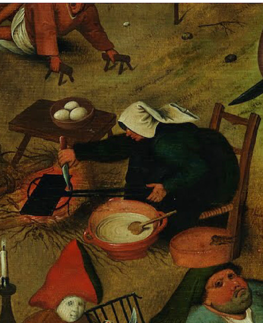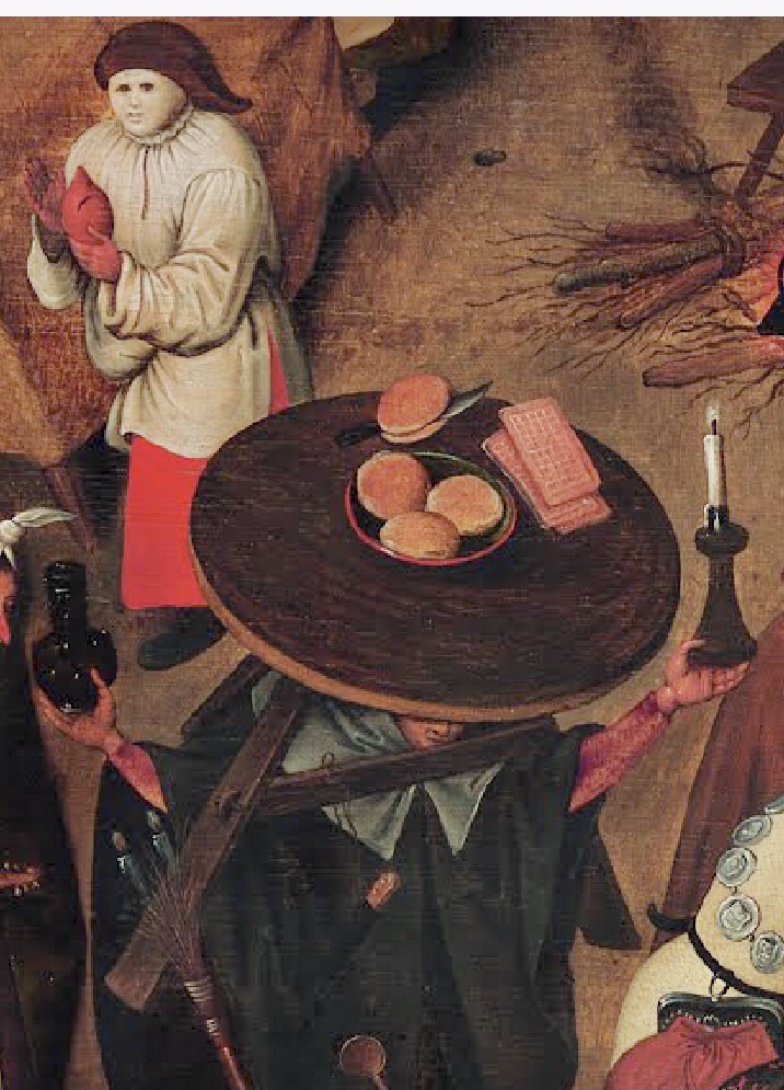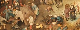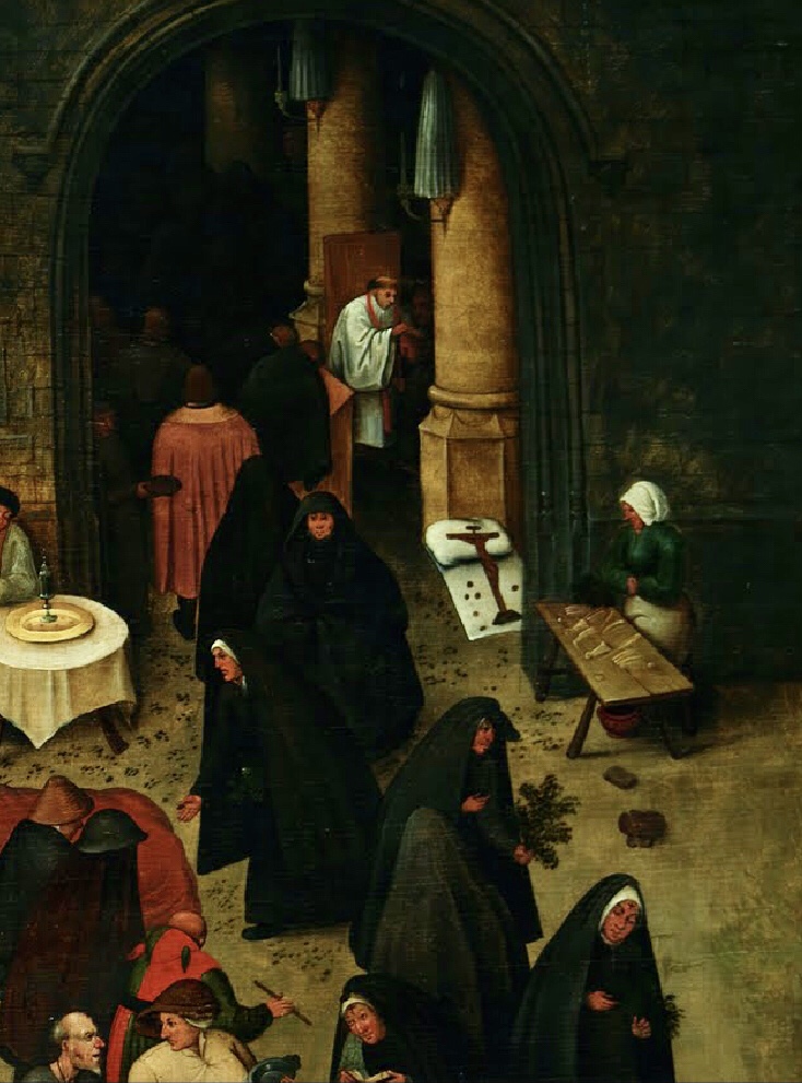 Le mardi gras se termine avec tous ses excès, Carême arrive et va gagner le combat, on peut déjà observer un lieu de prière, l’aumône est donnée, et le jeune qui se prépare ; mais Brueghel l’Ancien veut faire prendre conscience au spectateur de l’opposition entre les mondes ( gras – maigre) (bien portant – malade ou estropié) (envies irrépressibles – règles de l’observance) (catholique – protestant) veut-il y voir les prémices des guerres de religions qui arrive ? Il s’agit surtout d’une représentation d’un monde bouleversé par les luttes religieuses et politiques.