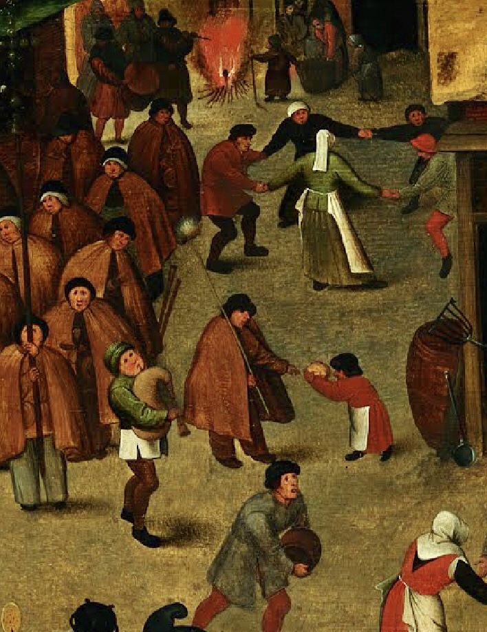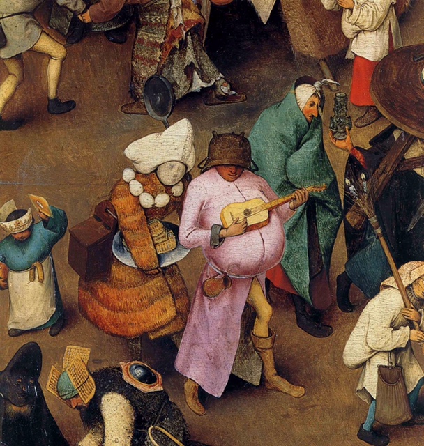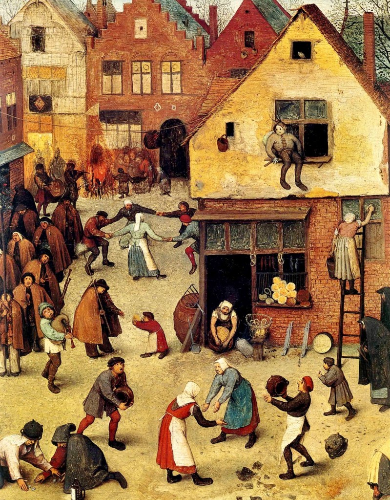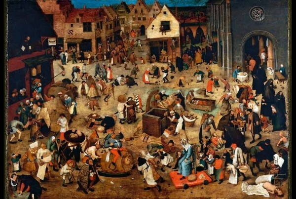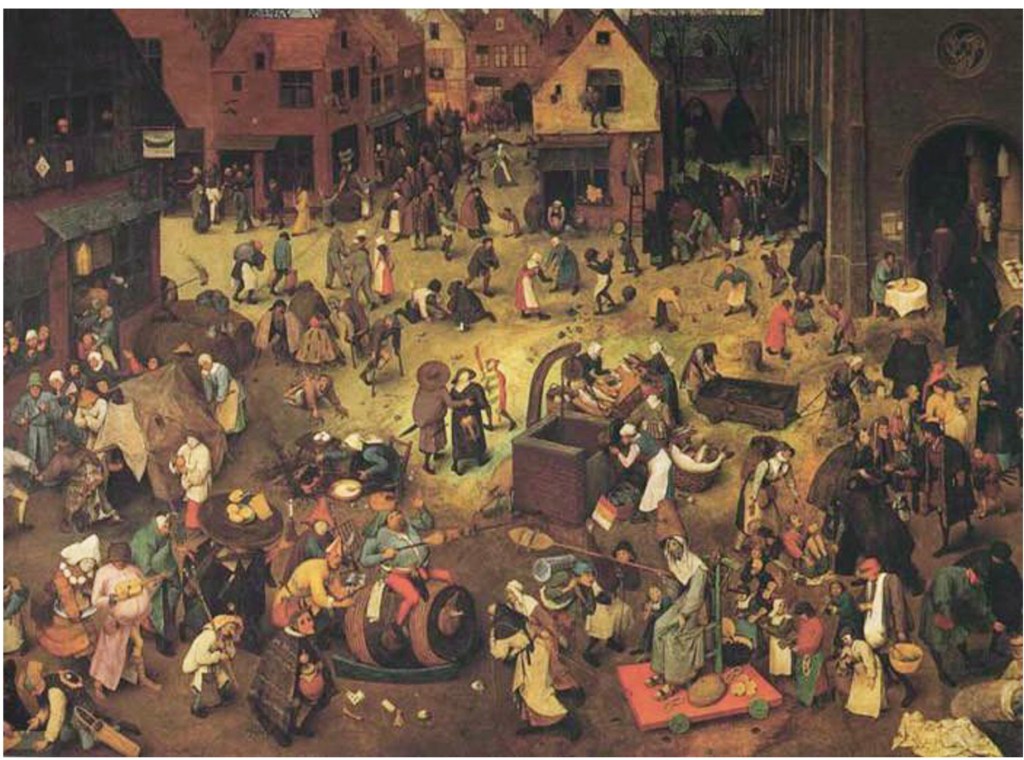 Depuis l’origine du Carnaval, les conventions et les règles sociales sont modifiées, bousculées et oubliées et c’est pourquoi cette fête continue de séduire encore aujourd’hui. Le roi devient un humble habitant, le mendiant est sacré roi du Carnaval, chacun se promène masqué ou grimé, et se cache derrière son masque pour faire ce qui lui est interdit en temps normal. Pieter BRUEGHEL peint ce moment du basculement du Carnaval vers le Carême sur la place du marché au centre d’un village.