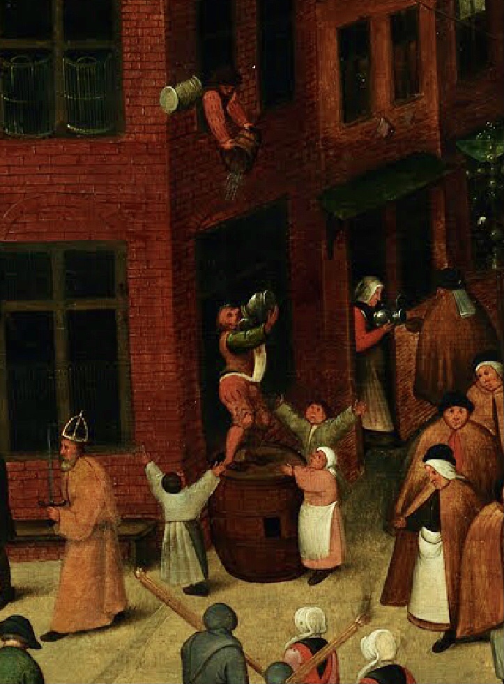 1) Le cortège de Carnaval descend vers la place en direction de l’auberge, serpente devant l’auberge pour rejoindre Monsieur Carnaval à califourchon sur son tonneau. Au fur et à mesure de la progression de la rue vers le premier plan le sérieux fait place aux défoulement, la musique retentit, des chansons sont entonnées, la bière coule, les jeux s’installent, le défoulement précède les excès… Tout devient possible!