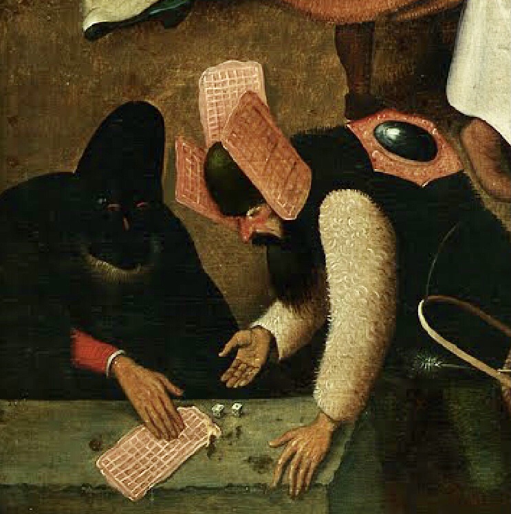 6) En plusieurs lieux de la place des joueurs drôlement habillés se livrent aux jeux de hasard, (dès, cartes) ces jeux s’opposent à ceux qui se déroulent près de l’église.