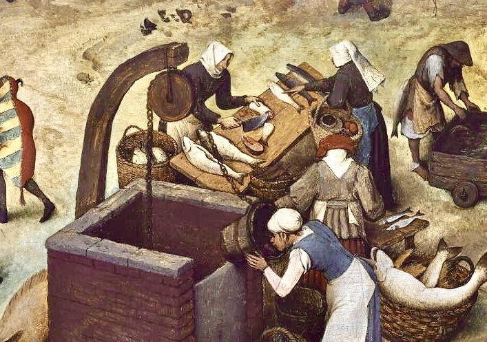 8) Le marché: La personne qui fait des crêpes tourne le dos à la poissonnière elle-même tournée vers l’église, l’étal de poissons énormes, est prêt pour les jours maigres de Carême, ils ne peuvent pas passer inaperçus! De même le puits placé au centre de la place à une valeur symbolique, une femme y trouve de quoi étancher sa soif. Au fond un marchande prépare un panier, les pâtisseries sont mises en devanture, une femme montée sur une échelle lave les carreaux.
