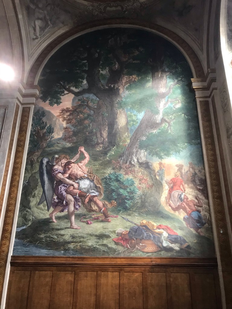 Au sommet de la toile, dans l’arc en ciel, signe de l’alliance, Dieu est figuré par un ange.