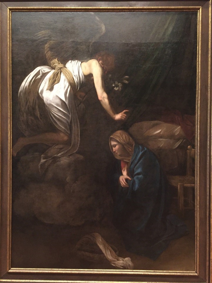 La lumière fortement contrastée introduit l’ange avec véhémence  au milieu de l’obscurité. Cette lumière éclaire 3 points : le dos de l’ange, la tête de Marie et une infime partie de l’arrière plan! L’ange Gabriel est un jeune adolescent ébouriffé en suspension vêtu d’un drap, peut-on imaginer qu’il n’est pas très propre ? La mise en lumière ne fait pas apparaître son visage !